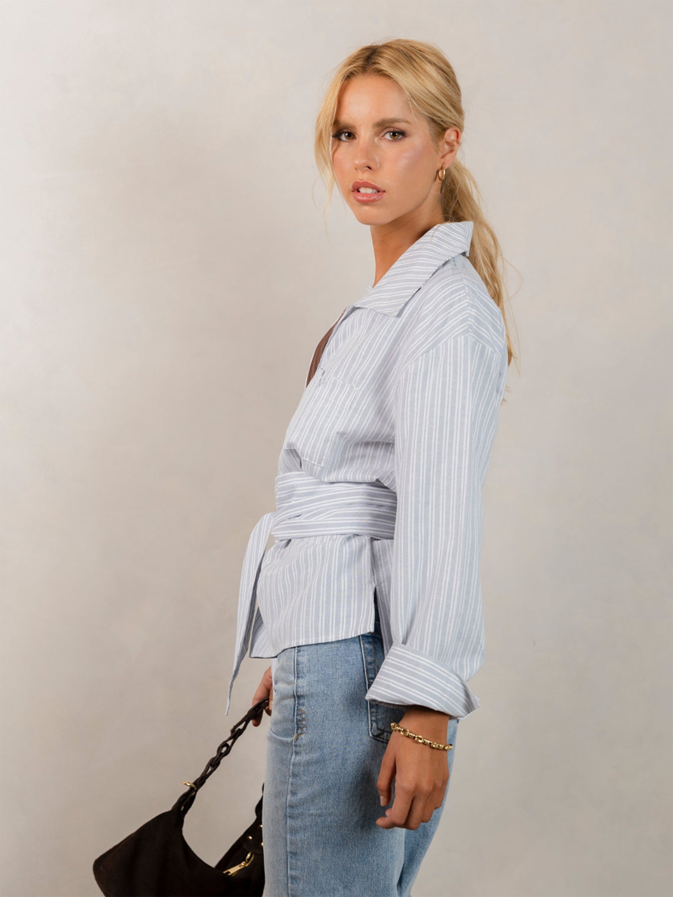 Blusa con cuello en v y amarra a la cintura.